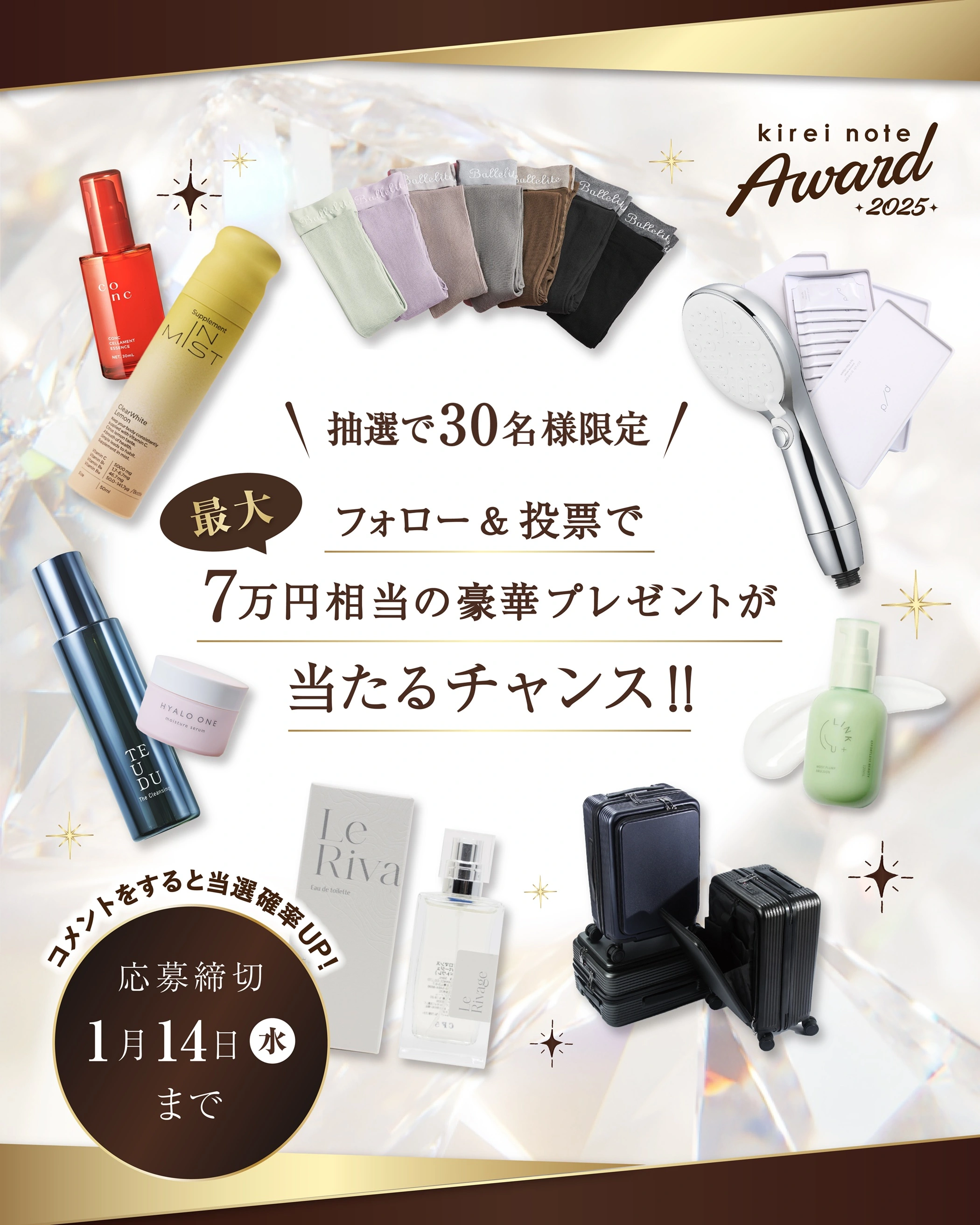 なお、キレイノートアワードでは、公式Instagramをフォロー&投票することで、ノミネートアイテムが当たるチャンスも用意されています。(締切:1月14日(水))